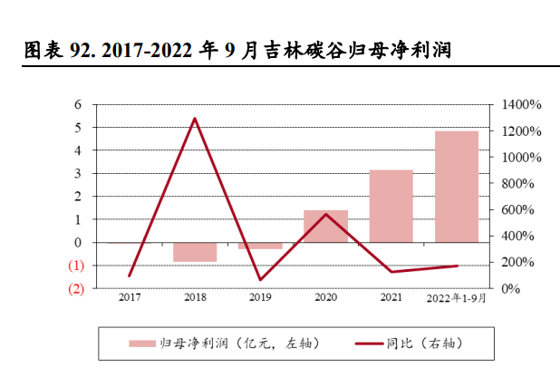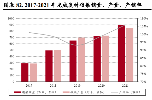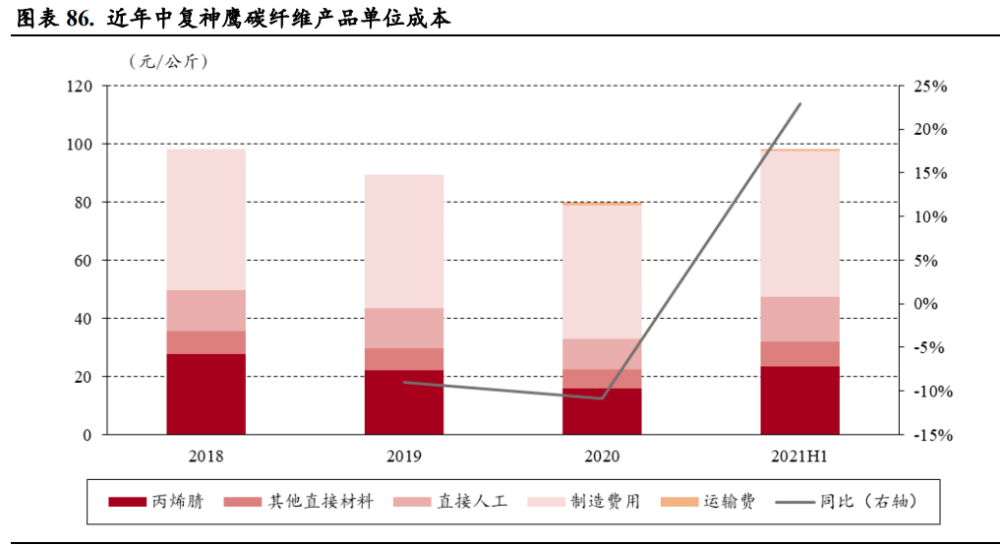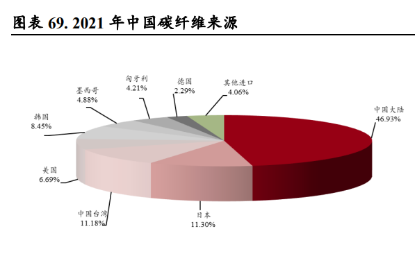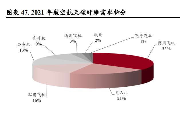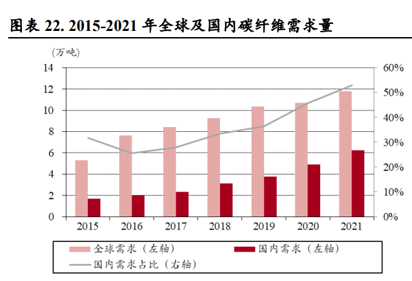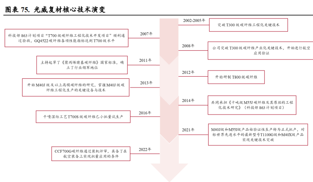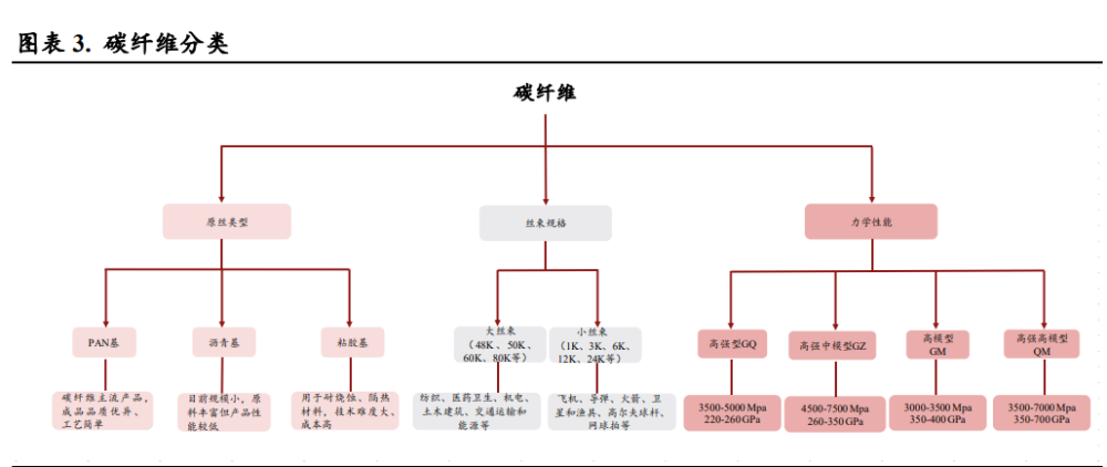 (报告出品方/作者:中银证券,余嫄嫄) 碳纤维:刚柔并济、性能卓越的“黑色黄金” 碳纤维是性能优异、用途广泛的国家战略性新材料 碳纤维是性能优异的军民两用新材料。碳纤维是一种由片状石墨微晶等有机纤维沿纤维轴向堆砌所 得、含碳量高于 90%的材料,由上游原料丙烯腈聚合、碳化所得。碳纤维“刚柔并济”,密度比铝 低、强度比钢高,在目前已大量生产的高性能纤维中具有最高的比强度和最高的比模量,同时具有 低密度、耐腐蚀、耐高温、耐摩擦、抗疲劳、震动衰减性高、电及热导性高、热及湿膨胀系数低、 X 光穿透性高、非磁体但有电磁屏蔽效应等特点,被誉为 21 世纪的“黑色黄金”,在国防军工及民 用领域均有广泛的应用前景,是不可或缺的国家战略性物资。 碳纤维行业起步于 20 世纪 60 年代,国外巨头占据全球市场主要地位。国际上碳纤维生产始于上世 纪 60 年代,日本进藤昭男发明了以 PAN 纤维为原料制取碳纤维的方法,为碳纤维工业化发展奠定 了基础。20 世纪 70 年代,日本东丽开发出高性能 PAN 基碳纤维。经过 50 多年发展,碳纤维生产 工艺已经较为成熟,目前日本、美国等国家的巨头企业掌握了碳纤维生产的核心技术。 我国碳纤维行业正快速发展。21 世纪以来,我国大力发展碳纤维产业,国内企业逐渐打破国外技术 封锁,逐步缩小与世界碳纤维先进生产技术的差距。目前我国已突破 T700、T800 等高性能碳纤维 的千吨级产业化;2019 年中复神鹰率先实现干喷湿纺 T1000 级超高强度碳纤维工程化,提升了我国 碳纤维行业整体技术水平;此外,国产 T700S-12K 小丝束碳纤维的复丝拉伸强度与模量也已达到日 本东丽同级别碳纤维性能水平。根据广州赛奥《2021 全球碳纤维复合材料市场报告》,2021 年我国 碳纤维运行产能达 6.34 万吨,同比增长 75.14%,占全球碳纤维运行产能的 30.5%,产能规模全球第 一,我国碳纤维行业进入快速发展阶段。 碳纤维可以根据其原丝类型、丝束规格、力学性能进行分类: 1)从原丝类型划分,碳纤维可以分为聚丙烯腈(PAN)基碳纤维、沥青基碳纤维和粘胶基碳纤维三 大类。聚丙烯腈(PAN)基碳纤维由于产品性能优异、工艺简单且无明显缺陷,逐步成为碳纤维市 场主流,在碳纤维产品中产量占比达 91%;沥青基碳纤维原料调制复杂、产品性能较低,目前规模 较小;粘胶基碳纤维碳化收率低、技术难度大、设备复杂、成本高,产量较小,主要用于耐烧蚀材 料及隔热材料。PAN 原丝经历预氧化、碳化、石墨化三个过程,最终转变成为具备片状的石墨纤维 结构。根据中复神鹰及吉林碳谷披露,生产 1 吨碳纤维约需消耗丙烯腈 1.96 吨。 2)从丝束规格划分,根据每条碳纤维丝束中单丝数量,可划分为 1K-24K 的小丝束与 48K-80K 的大 丝束。小丝束产品抗拉能力更强,生产成本更高,大多应用在国防军工以及体育用品中,而大丝束 主要应用在工业、能源领域; 3)从力学性能划分,根据聚丙烯腈基碳纤维国家标准 GB/T 26752-2020,可以分为高强型(GQ)、 高强中模型(QZ)、高模型(GM)、高强高模型(QM),其中高强指拉伸强度大于 3,500 MPa, 高模量指拉伸弹性模量大于 350 GPa。根据光威复材招股说明书披露,国产的碳纤维型号性能对等 东丽:GQ3522(T300)、GQ4522(T700S)、QZ5526(T800S/T800HB)、QM4035(M40J),其 中 GQ3522 等指代产品拉伸模量大于 3,522 MPa、T700 指代产品强度约为 700 PSI。 碳纤维产业链包括从上游丙烯到下游终端应用的完整工艺流程。首先,上游企业从石油、煤炭、天 然气等化石燃料中制得丙烯,经氨氧化后得到丙烯腈(AN)。丙烯腈经聚合和纺丝后,得到聚丙烯 腈(PAN)原丝。原丝再经过预氧化、低温(90%以上含碳量,1,000-2,000℃)和高温碳化后,得 到碳纤维(99%以上碳含量,2,000-3,000℃)。碳纤维经过表面处理后,可制成碳纤维织物和碳纤 维预浸料(中间料)。另外,碳纤维与树脂、陶瓷等材料结合还可形成碳纤维复合材料。最后经各 种成型工艺,可得到下游终端应用产品。碳纤维产业链下游应用包括风电、航空航天、体育休闲等 领域。 原丝和碳化是碳纤维生产的关键环节 碳纤维生产包括原丝和碳化两个过程。原丝生产按照聚合和纺丝的连续性分为一步法和两步法,一 步法包括聚合、纺丝,两步法则包括聚合、制胶、纺丝;按照纺丝工艺,主要分为湿法纺丝和干湿 法纺丝。纺丝工艺的选择及控制是保证高性能原丝稳定生产的关键因素。原丝经过一段氧化、二段 氧化、三段氧化、低温碳化和高温碳化,再经过浆料表面处理,然后上浆,即可生产出碳纤维。 原丝环节成本约占碳纤维生产成本的 51%,是碳纤维生产的核心环节。碳纤维强度依赖于原丝的微 观形态结构及其致密性。若原丝品质有所缺陷,如表面孔洞、沉积、刮伤、单丝间黏结等,在后续 加工中很难消除,将对碳纤维性能产生较大影响。根据美国橡树岭国家实验室(Oak Ridge National Laboratory),原丝成本约占碳纤维生产成本的 51%。低质量原丝将增加碳纤维的生产成本,也将降 低产品的市场竞争力。 碳纤维行业规模效应显著,生产成本长期有望下降 2022 年碳纤维价格上涨后回落。根据百川盈孚统计,2022 年上半年碳纤维价格稳定增长,国产小丝 束 T700 最高涨至 270.00 元/千克,同比上升 14.89%。下半年由于国内碳纤维企业大幅扩产、供应量 增加,碳纤维价格有所回落。进口方面,2022 年 1-10 月碳纤维进口总量达 8,596.35 吨,相较于去年 