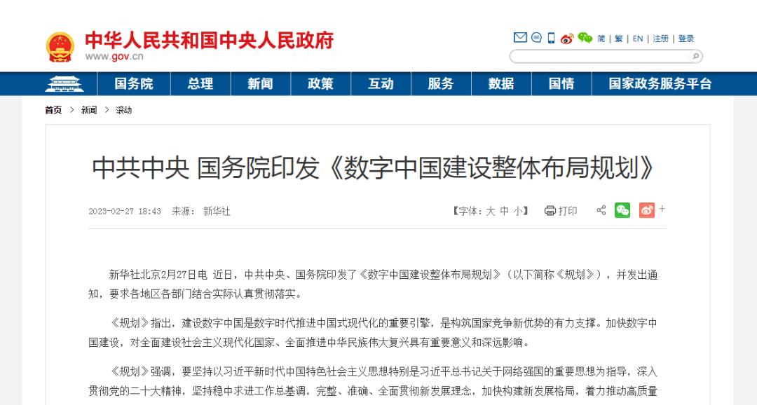 此前,中共中央、国务院印发了《数字中国建设整体布局规划》(以下简称《规划》),并发出通知,要求各地区各部门结合实际认真贯彻落实。重磅文件,顶层设计,指明了中国数字化方向。