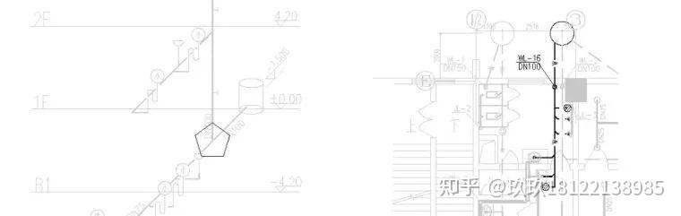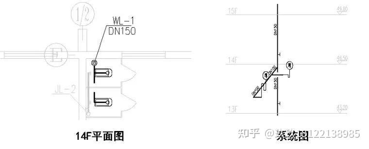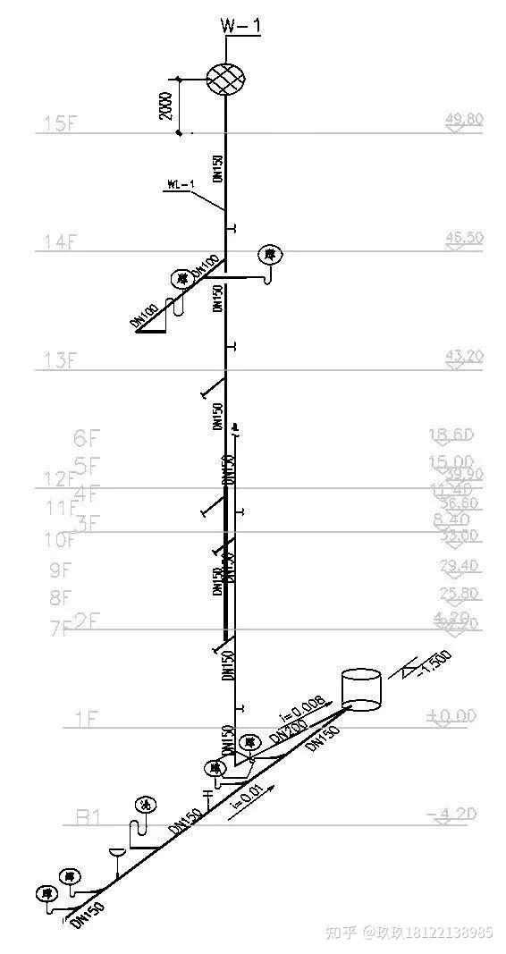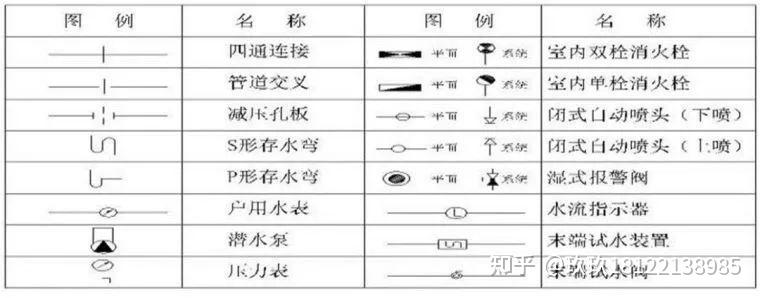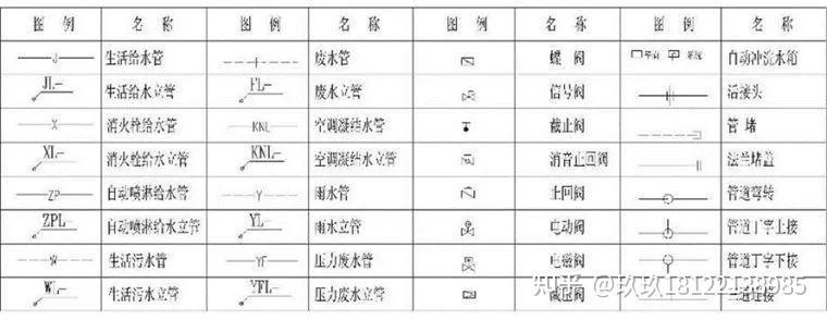 给排水工程: 1、建筑给排水工程包括:给水、排水、热水、消火栓、自动喷淋等常用系统,其管道当中流动的是水。(其管道输送介质为水) 2、给排水系统的主要功能: (1)建筑给水系统的任务,就是经济合理地将水由室外给水管网输送到装置在室内的各种配水龙头、生产用水设备或消防设备,满足用户对水质、水量和水压等方面的要求,保证用水安全可靠。 (2)建筑热水系统的任务,大多数情况下是为人们提供符合舒适要求的水量、水压、水质、水温的卫生热水。 (3)建筑排水系统的任务,就是将室内的生活污水、工业废水及降落在屋面上的雨、雪水用最经济合理的管径和走向,排到室外排水管道中去,为人们提供良好的生活、生产与学习环境。 (4)消防给水设备是建筑物最经济有效的消防设施;常用的消防给水设备包括消火栓灭火系统和自动喷水灭火系统。但在现代建筑中,移动式灭火设备及其他方式的消防设备也被包含在建筑消防设计当中。 3、给排水系统图例 给排水工程的图例一般都比较形象和简单,不过初学者还是会觉得陌生,需要进行一段时间的强行记忆,但是在联系实物形状后,就能融会贯通,遇见陌生的图例时也能进行推测,迅速接受。例如:热水管道是在粗实线中缀以字母“R”,即为“热”的汉语拼音的辅音字母;蹲便器的图例就是一幅蹲便器的简略平面图。 1)在给水排水工程图中各管道无论管径大小均是以单线表示,管道上的各种附件均用图例表示。参见GB/T50106-2010《给水排水制图标准》。 2)为突出管道与用水设备的关系及管道的布置方式,在管道平面布置图中建筑物的轮廓线用细实线绘制。 3)在管道平面布置图中,管道无论是明装还是暗装,管道线仅表示其所在范围,并不表示其平面位置,如管道与墙的距离等。     一般常用的: 给水管道-J,如果分高低区通常用首字母表示即高区-G,低区-D。 排水管道-W,表示污水。也有-F,就是废水。很少见有用-P表示的。 消火栓管道-XH。 自动喷淋管道-Z或者-ZP;雨水管道-Y; 采暖管道-R,一般实线表示供水管,虚线表示回水管。 压力排水-PY;冷凝水管道-N。管道立管-L。 另外设备的型号字母: Q-流量或者风量;H-扬程;N-功率;P-压力;QW-潜污泵。 其他阀门、器具之类的都是用图形区分。 JL-给水管;WL-污水管;YL-雨水管;RJL-热给水;RHL-热回水。 4、读图 4.1、给排水工程图纸由给排水系统图(或系统原理图)、给排水平面图、图纸说明组成。 4.2、给排水系统图和原理图的区别: 系统图:较为严格的按照轴测图的绘图原理绘制,主要突出空间内各个方向的线条的相互关系,立体感较强。 原理图:以突出系统原理和构成为原则,各线条的空间还原性较差,不利于构建整体的立体感。但是清晰易懂。 4.3、给排水专业系统图中,平行、垂直、45度线条繁多,空间关系上前后叠影但不相连的管道也很多,再加上标高、管径、楼层线等辅助线条林立,最容易造成系统图识图中的找错线条、并错管道的现象,所以我们在系统图识图时可以采用删除或者遮蔽一些管道的做法,使我们希望看清楚的部分凸显出来,会更加有利于我们准确、清晰地识图。 系统简化: 在通读污水系统(W-1系统)之后发现从2层开始一直到14层,图纸上表达出了一个意思:WL-1立管从上至下,楼层的排水横管构造都一样,图纸上仅表达了第 14层的排水横管。WL-1立管从上至下,加上一层设置的一根横管,形成了整个W-1系统。我们对W-1系统进行简化后得到下图:  生活污水系统原理图WL-1系统简化 4.4、给排水平面图和系统图的结合 给排水工程平面图主要表达各层用水房间所配置的卫生器具及给排水管道、附件在平面位置情况。 给排水工程系统图(或系统原理图)主要表达从底层到顶层管道立体走向,常用斜轴侧投影的方法绘制。(表示内容:管道的空间布置,各管段管径,坡度,标高以及附件在管道上的位置。)所以,需将系统图和平面图紧密结合。才能清楚的知道完整的做法。 例如: 4.4.1横置的“T”符号是排水立管的检查口。基本按照每两层一个设置,这些内容在平面图中无法绘出,所以要仔细看系统或者原理图。 4.4.2平面图和系统图的标高:排水系统的横管位于本层楼层之下,在平面图上看,如14层的排水平面图的管道,示意的是在14层楼板之下的管道。在系统上这部分横管是归属13层到14层之间。需清楚的知道需看系统图的哪个部位。  4.4.3 排水管道的横管与横管、横管与立管的连接必须采用45°三通,45°四通或90°斜三通, 90°斜四通。  从上面系统图圈住部分看,该处及为三通,但是结合平面图,可以发现,该处应使用斜三通。 设计图中排水管道未注明坡度的, 均采用标准坡度。即:  还有种情况就是平面图和系统图中都没有坡度的标注,但是说明当中的上文文字叙述对排水管道德坡度做出了规定和要求的。那么就应带按照设计说明的坡度来执行。 5、给水排水工程的识读内容与技巧 5.1识图方法和步骤 阅读建筑给水排水工程图纸时,一般按水的流向阅读。 给水工程图识图顺序: 引入管—干管—立管—横管—支管—放水龙头 排水工程图识图顺序: 卫生器具—排水支管—排水横管—排水立管—排水干管—排出管 看图时从粗到细,从大到小,先看基本图例和说明,再看平面图、系统图和详图。 5.2给水排水工程平面图。 识读时由底层开始逐层阅读各层平面图,由平面图获得以下信息: 5.2.1)给水系统进