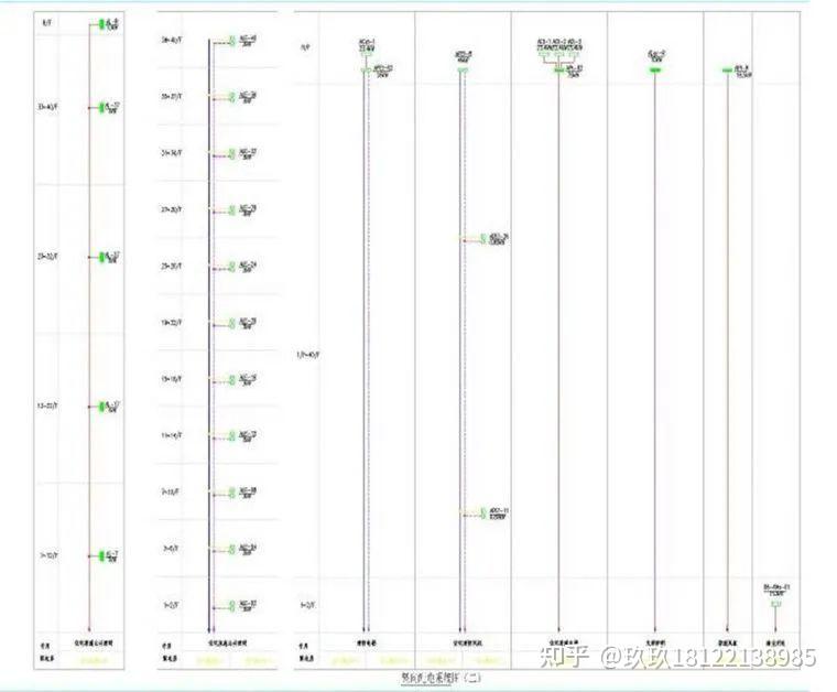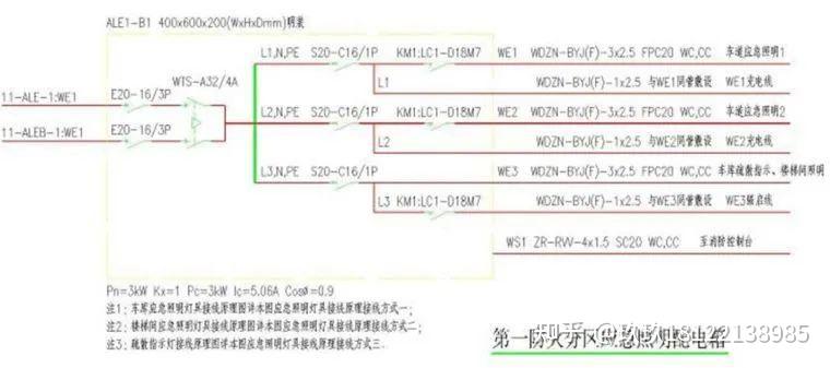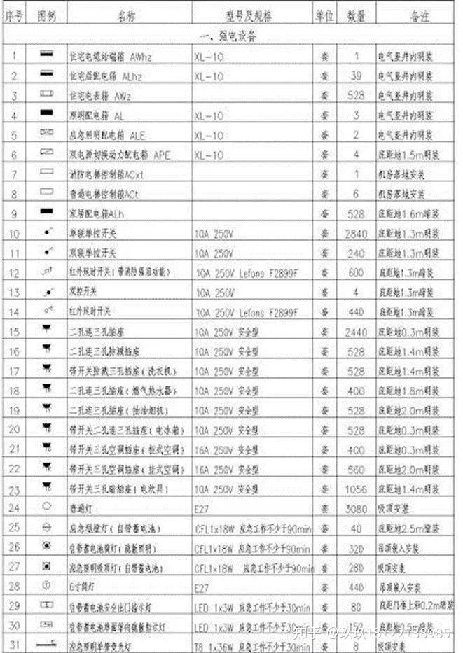 4、读图 4.1、电气图纸按图纸的表现内容分,一般有电气平面图、配电系统图、详图、图例、设备材料表、设计说明、图纸目录等。 4.2、电气平面图: 电气平面图是将同一层内不同安装高度的电气设备及线路都放在同一平面上来表示,在建筑平面图上标出电气设备、元件、管线、防雷接地等的规格型号、实际布置。一般大型工程都有电气总平面图,中小型工程则有动力平面图或照明平面。  动力干线平面图 4.3、配电系统图 配电系统图大致分为:配电箱系统图、竖向配电系统图、高低压配电系统图等。 4.3.1所谓配电箱系统图,是示意性地把配电箱的供电线路用单线连接形式准确、概括的电路图,它不表示相互的空间位置关系,表示的是各个回路的名称、用途、容量以及主要电气设备、开关元件及导线规格、型号等参数。  4.3.2竖向配电系统图 竖向配电系统图是直观的反应配电系统的竖向关系,工作回路等。  4.3.3高低压配电系统图 高低压配电系统图是系统的,以表格统计的形式反应出各回路的出处、回路编号、线径规格等。  4.3.4详图 详图用来表示某一具体部位或元件的结构或具体安装方法,注明设备或部件具体图形详细尺寸,以便于安装。通常采用通用标准集,在没有标准图可以选用并有特殊要求时,可以绘制大样图。大样图可以画在同一张图纸上,也可以另画一图或多图。 5、建筑电气工程读图注意要点 5.1、电气工程大多采用统一的图形符号并加注文字符号绘制出来的。因为构成电气工程设备、元件、线路很多,结构类型不一,安装方式各异,只有借用统一的图形符号和文字符号来表达,才能说明清楚。因此,阅读图纸前必须熟悉图形符号和文字符号所代表的含义。 5.2、电气工程施工,往往与主体工程(土建工程)及其他施工相配合进行。例如:电气设备的布置与土建平面布置,立面布置有关;安装方法与墙体结构有关;特别是一些暗敷设线路、电气设备基础和预埋件,更与土建工程密切相关。因此,阅读电气建筑图纸时应与土建施工图对应起来阅读。 5.3、电气工程图中有关安装等方面的技术要求和安装方法,在有关的国家标准和规范、规程中有明确规定,因此,有些图纸并没有完全反映出来,只是在说明中注明参照“***标准图集”、“***规范”等等,这就要求我们应在读图同时配合相关规范、标准、图集以全面了解图纸要求。 5.4、[对一个读图者来说,设计说明是必须认真阅读和研究的内容。因为它常常是指点迷津的钥匙 ] 设计说明主要标注图中交代不清,不能表达或没有必要用图表示的要求、标准、规范、方法等,如供电电源来源、线路敷设方式、设备安装方式施工注意事项等。根据工程规模及需要说明的内容多少,有的可以单独编制说明,有的因为内容简短,分项局部问题可以写在分项图纸内的空余处。